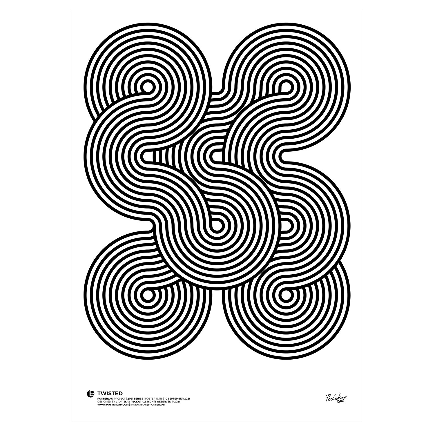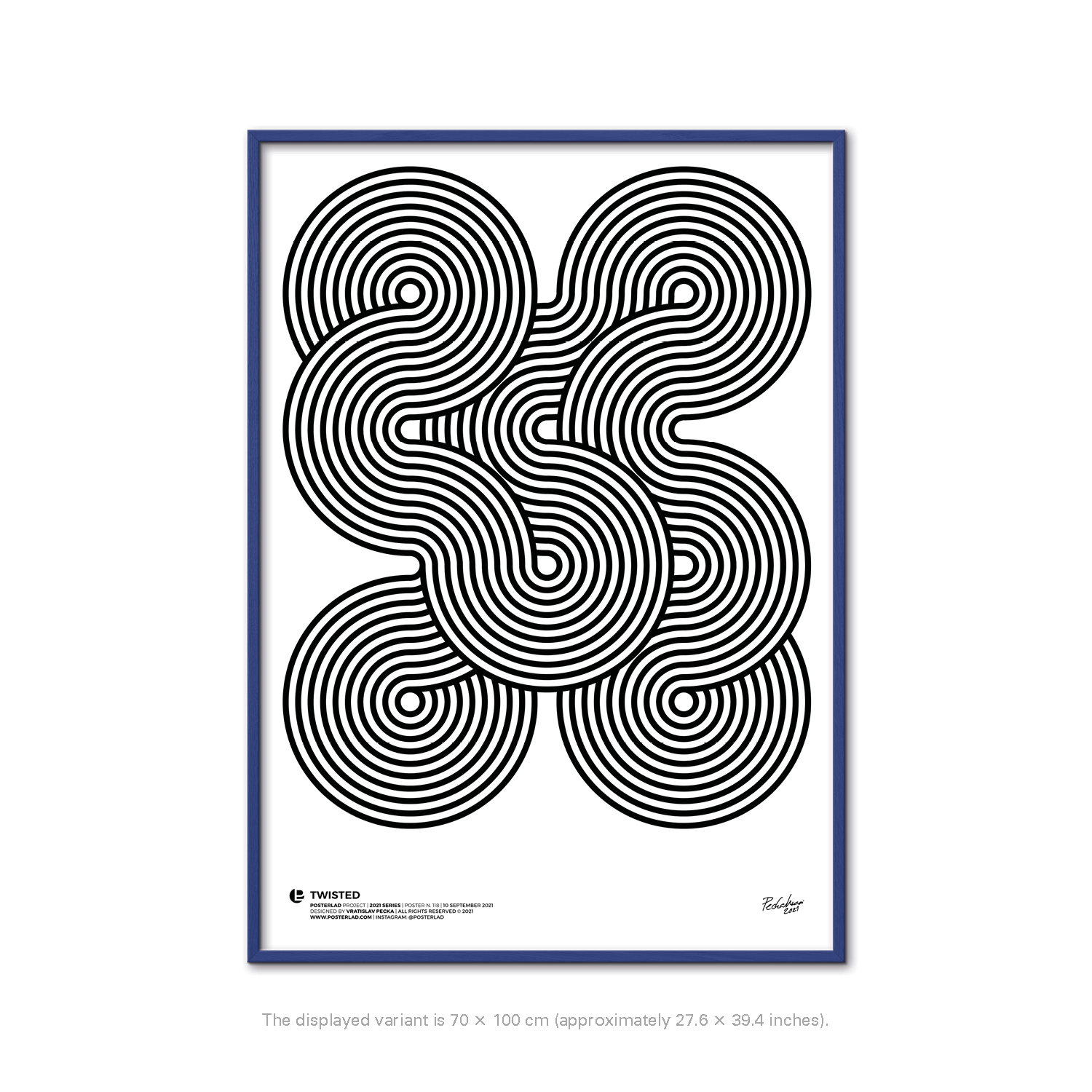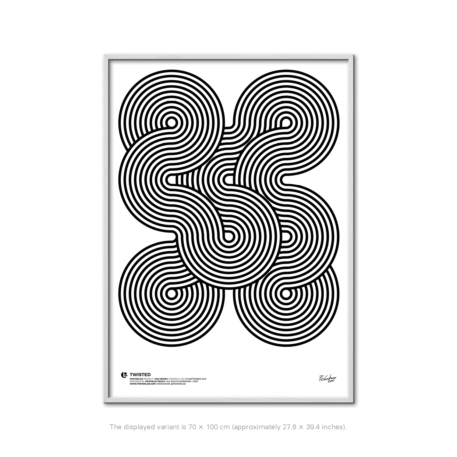 The "Twisted" poster features an intricate labyrinth of black concentric lines that form twisting, overlapping circular patterns. The design is hypnotic and mesmerizing, drawing the viewer's eye into its continuous flow of curves. The symmetry and repetition create a sense of rhythm, while the stark black-and-white contrast emphasizes its bold and modern aesthetic.
