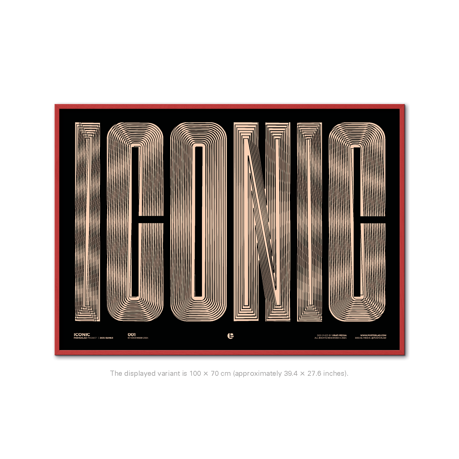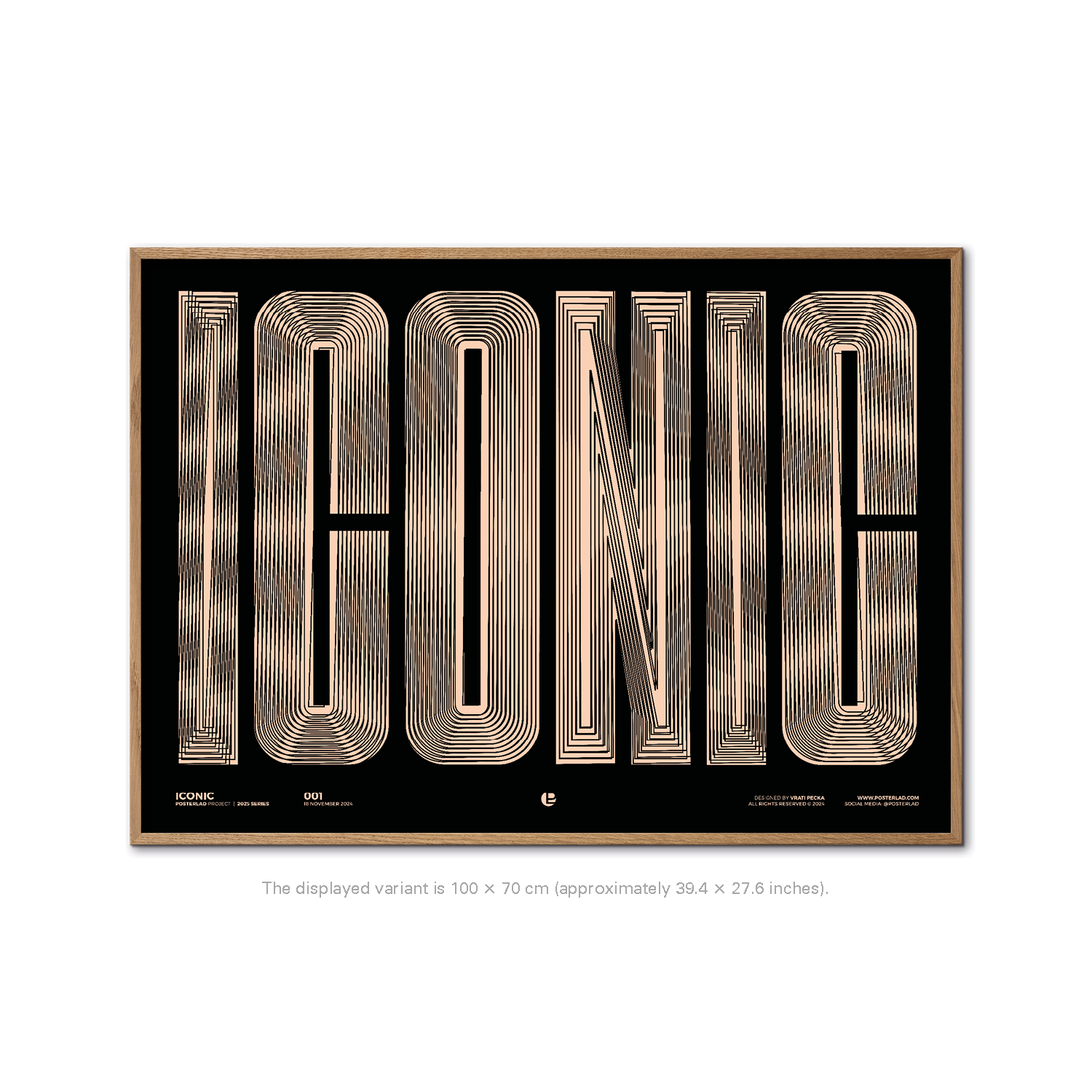 The poster titled "Iconic" features the word "ICONIC" in bold, all-caps typography, taking center stage against a sleek black background. The letters are intricately designed with fine, parallel lines in a metallic gold hue, creating a layered, almost three-dimensional effect. The lines subtly shift and overlap within each letter, giving the text a dynamic, shimmering appearance that draws the eye.