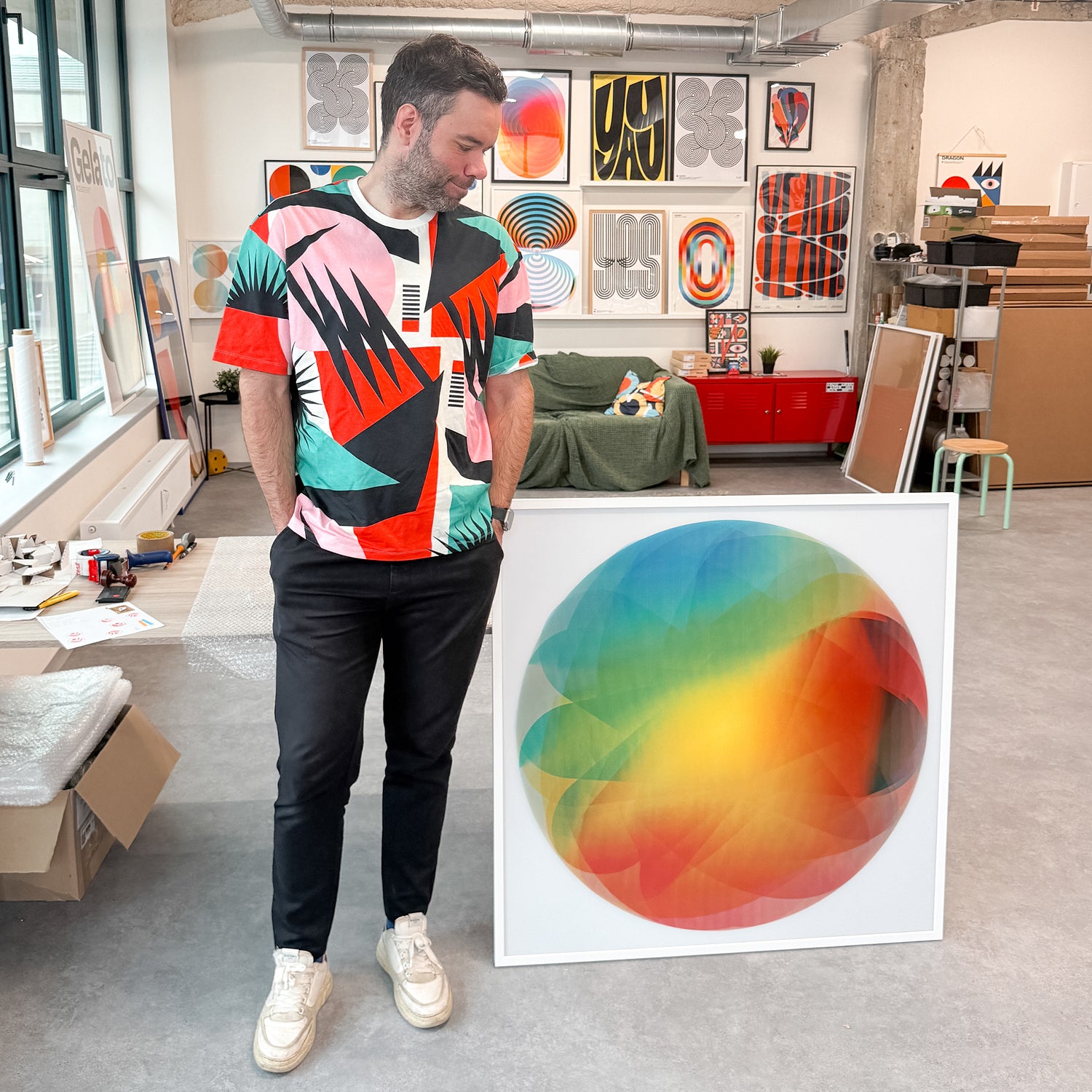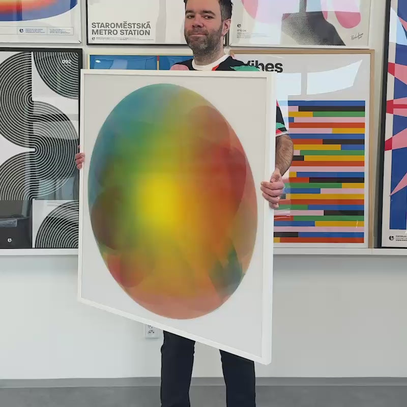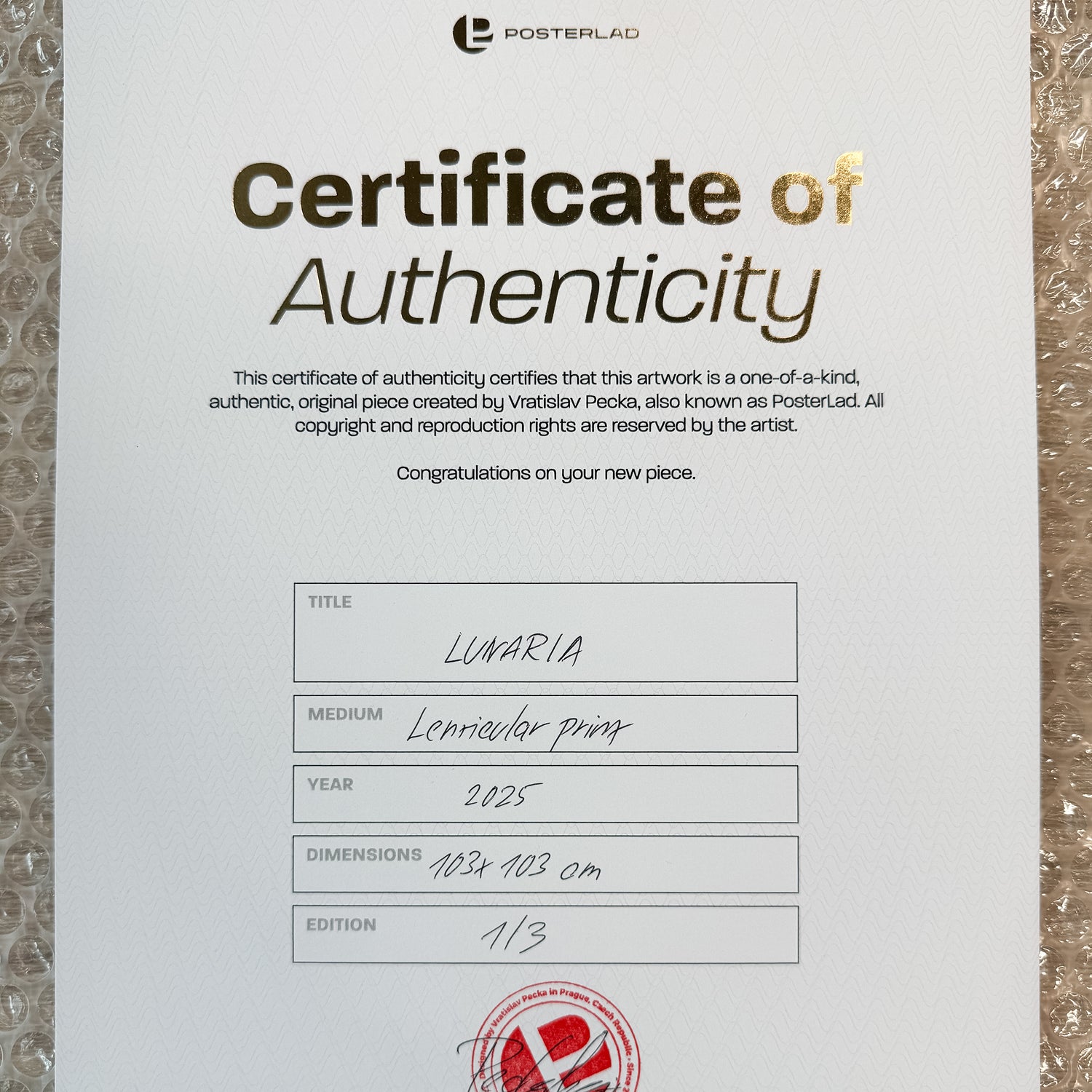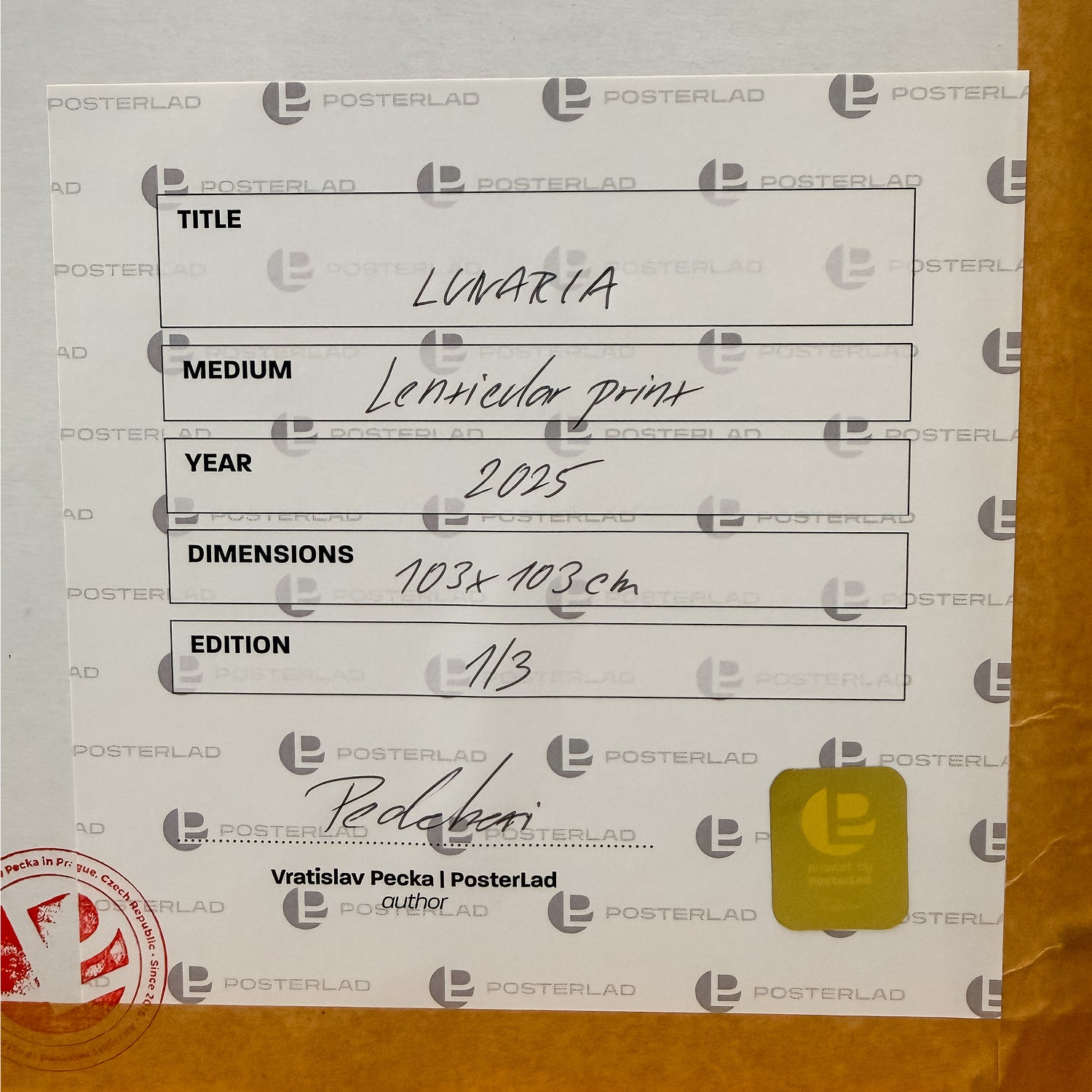 PosterLad's artwork, a lenticular print (20 LPI) measuring 100x100 cm (103x103 cm in a white wooden frame). Hand-signed, stamped and numbered by the artist.