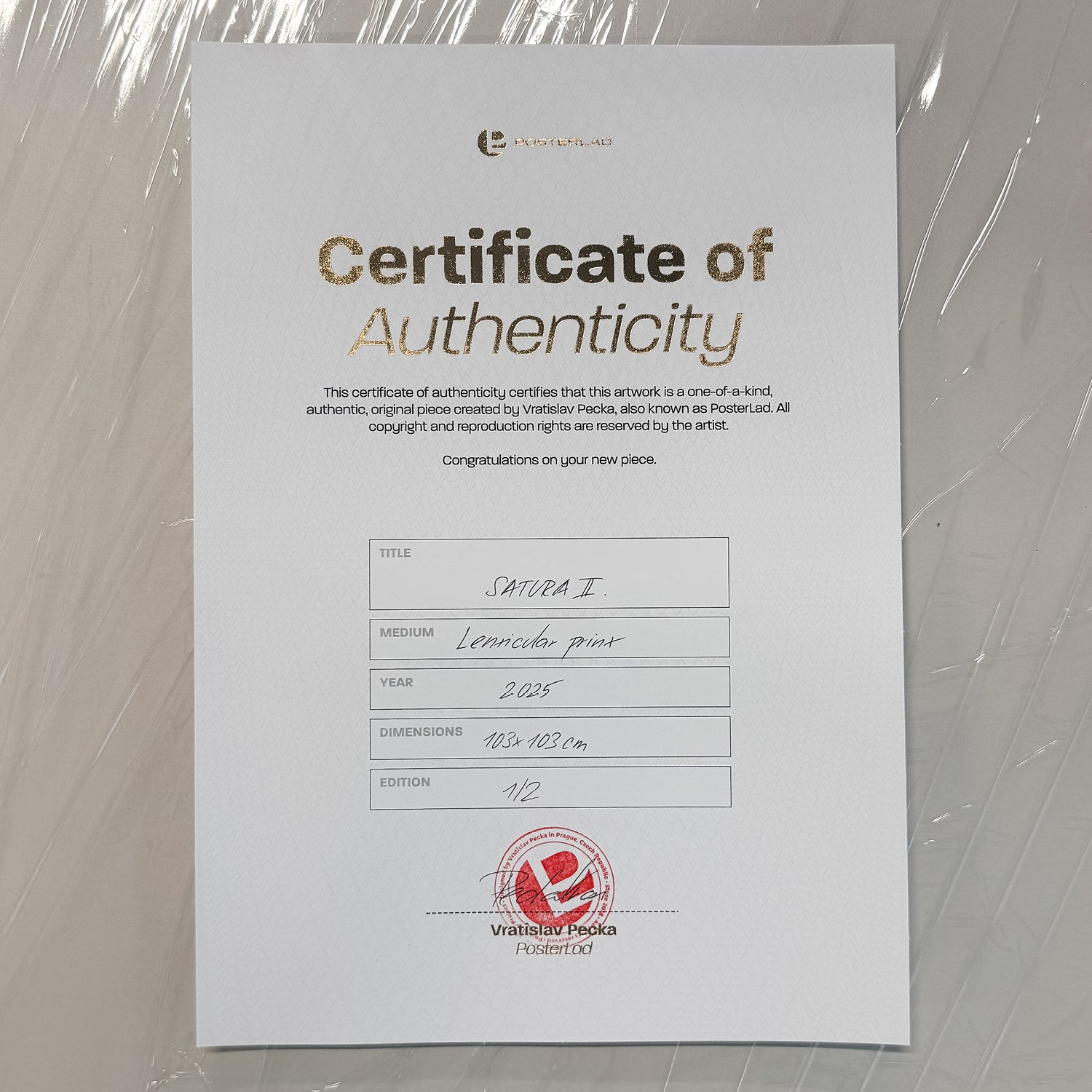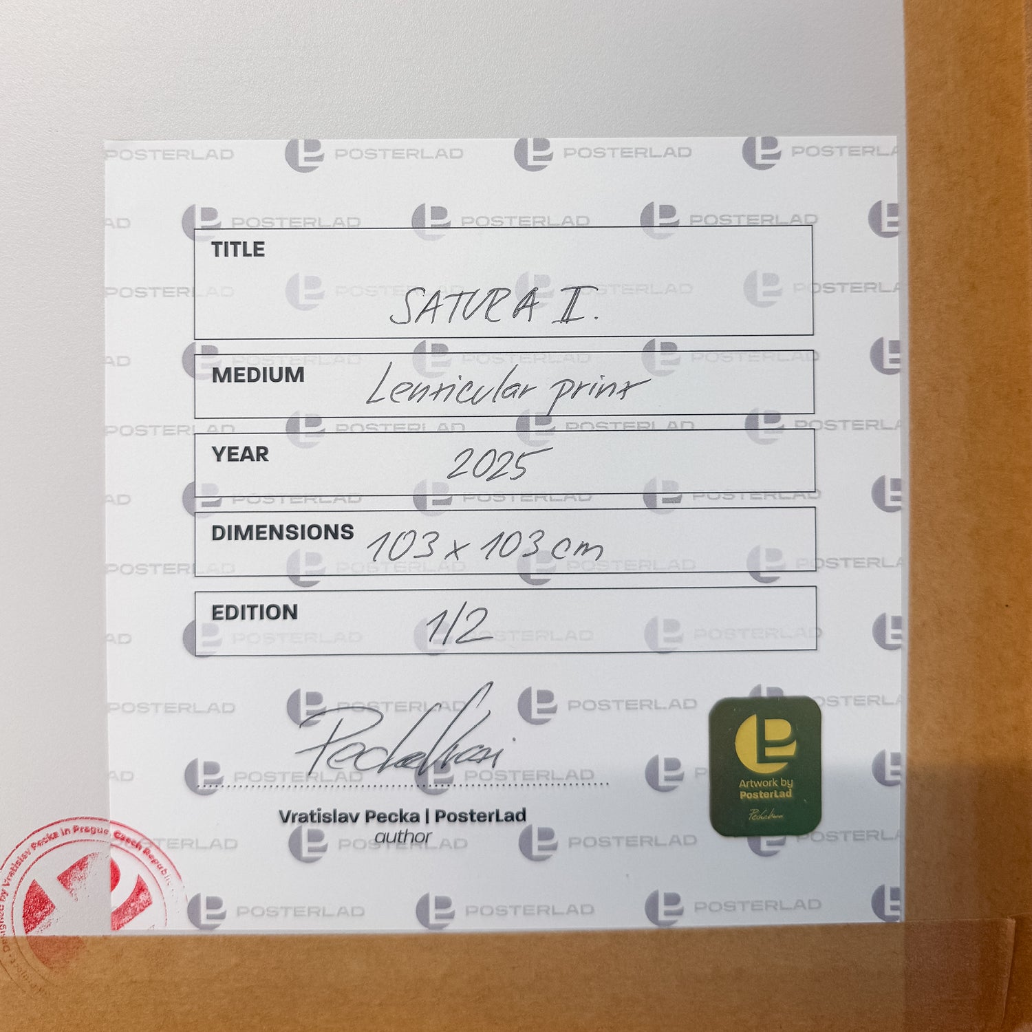 PosterLad's 1/1 artwork, a lenticular print (20 LPI) measuring 100x100 cm (103x103 cm in a white wooden frame). Hand-signed, stamped and numbered by the artist.