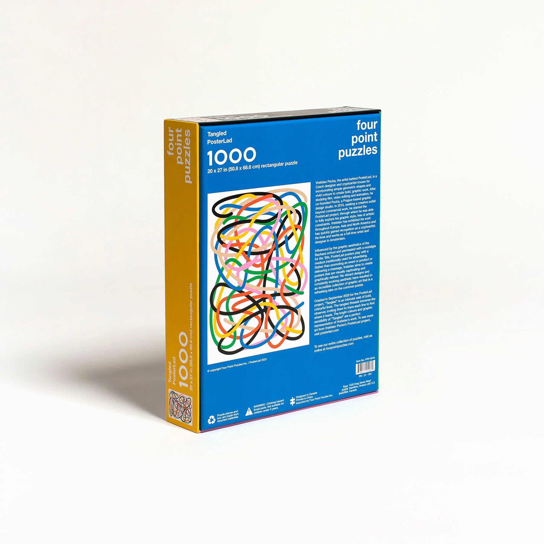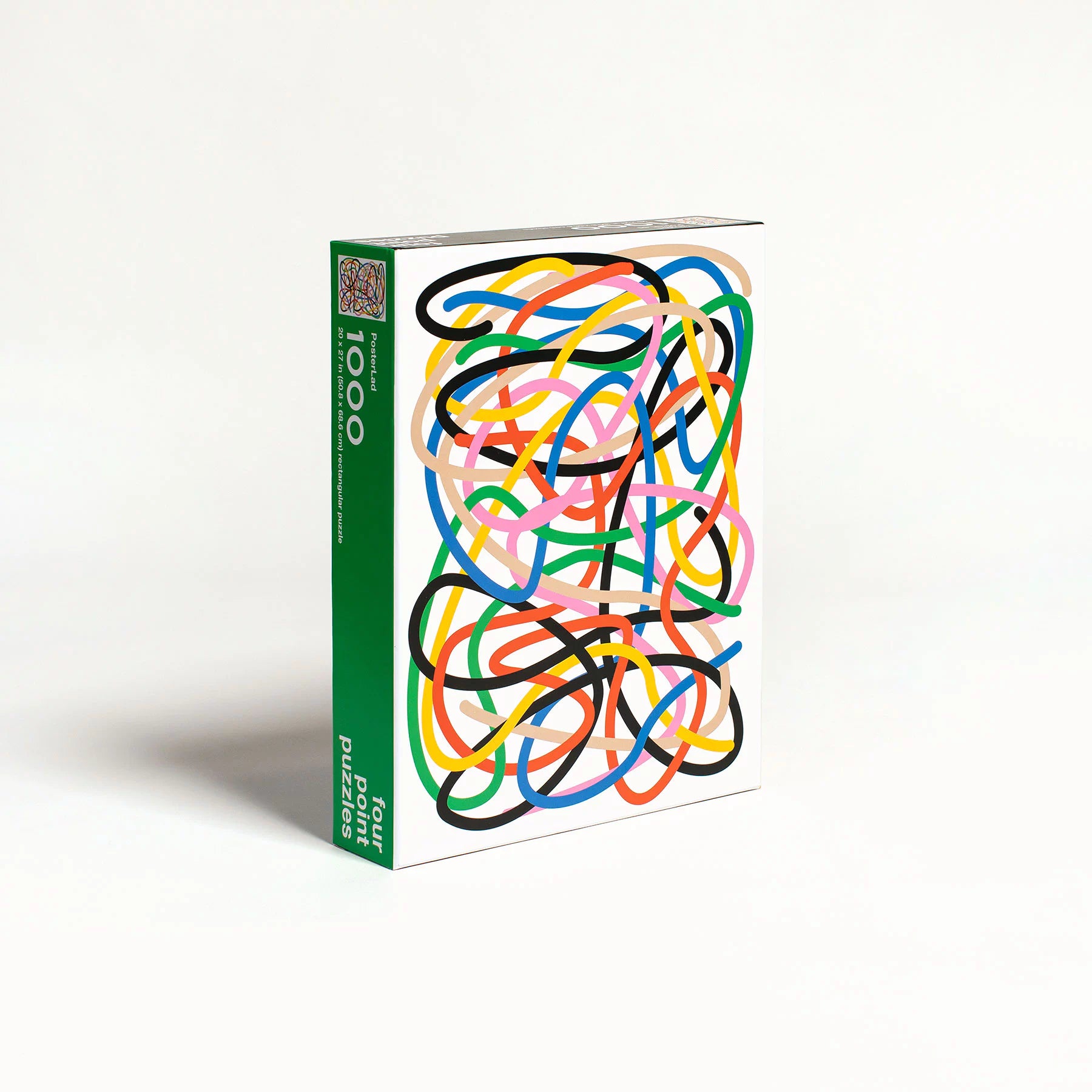 This 1000 piece, 50.8 x 68.6 cm rectangular puzzle features Vratislav's Tangled illustration, an intricate web of bold, colourful lines. The tangled threads immerse the observer, inviting them to trace each line to find where it leads.