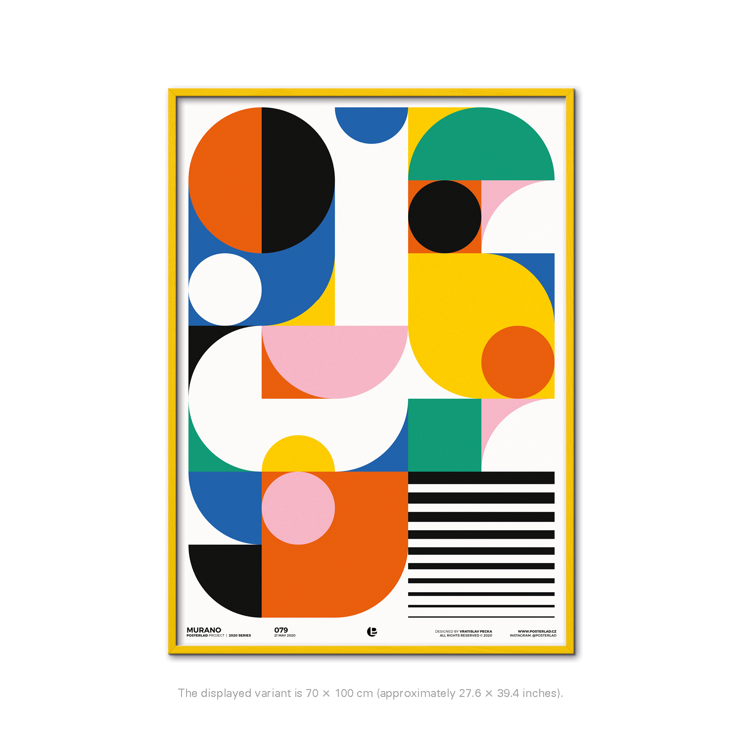 The "Murano" poster features a vibrant and playful composition of geometric shapes and bold colors. It consists of circles, semicircles, rectangles, and stripes that overlap and interact to create a dynamic, abstract design. The design feels balanced and modern, with a nod to mid-century aesthetics. It carries a cheerful and artistic vibe, evoking the energy of glass art or mosaics, inspired by the Italian island of Murano.