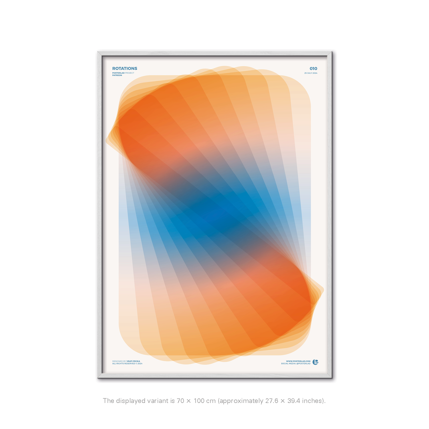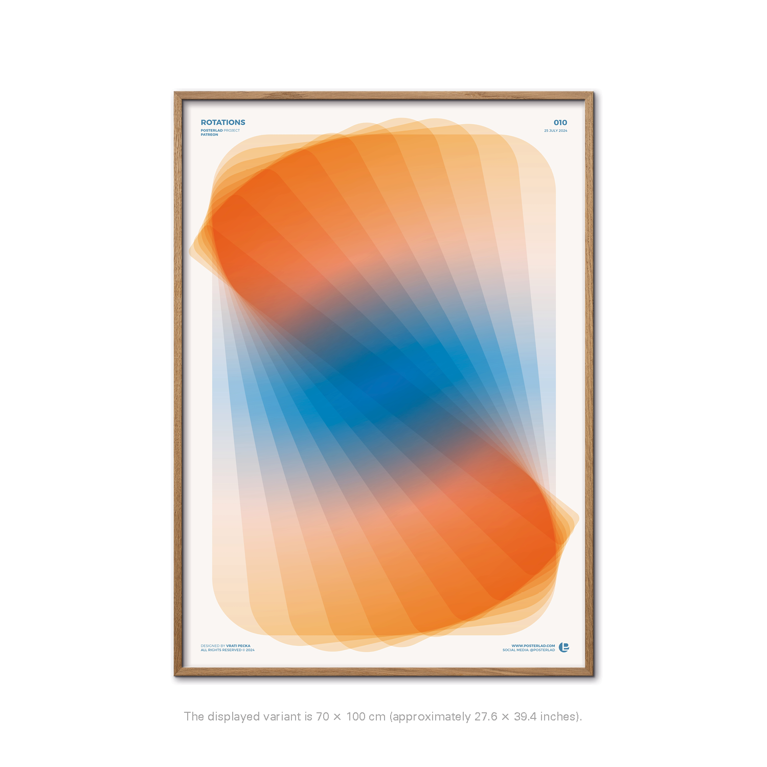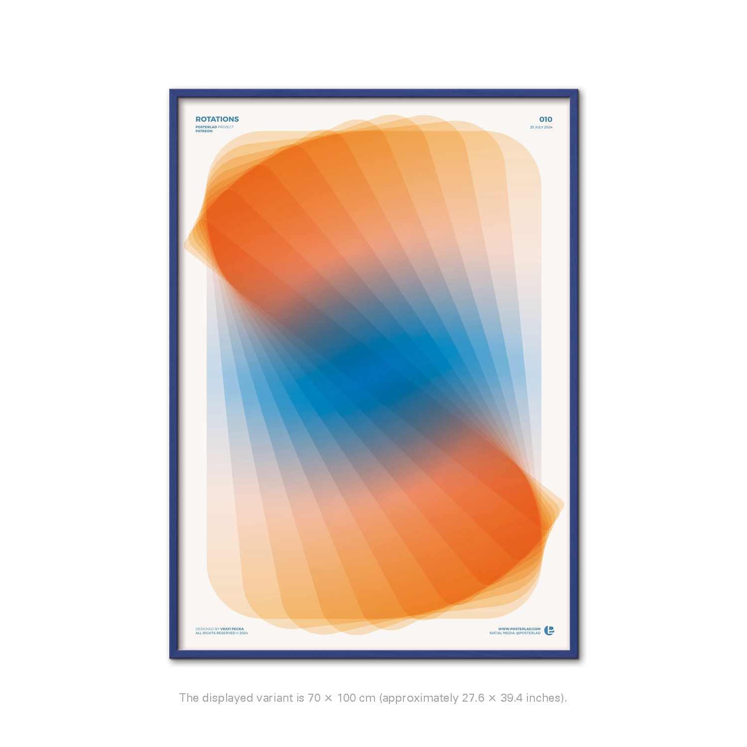 The poster titled "Rotations" features a mesmerizing abstract design composed of overlapping translucent shapes arranged in a symmetrical pattern. The forms are gradient-filled, transitioning from vibrant orange at the edges to a cool, vivid blue at the center. The layering effect creates a sense of depth and motion, as though the shapes are gently rotating or spinning in space.