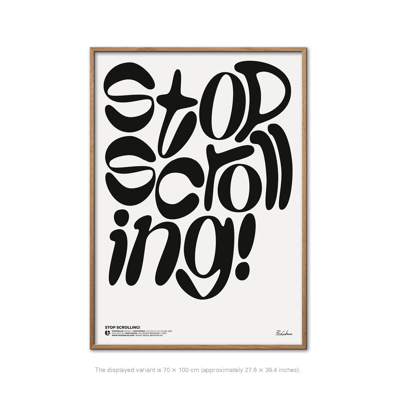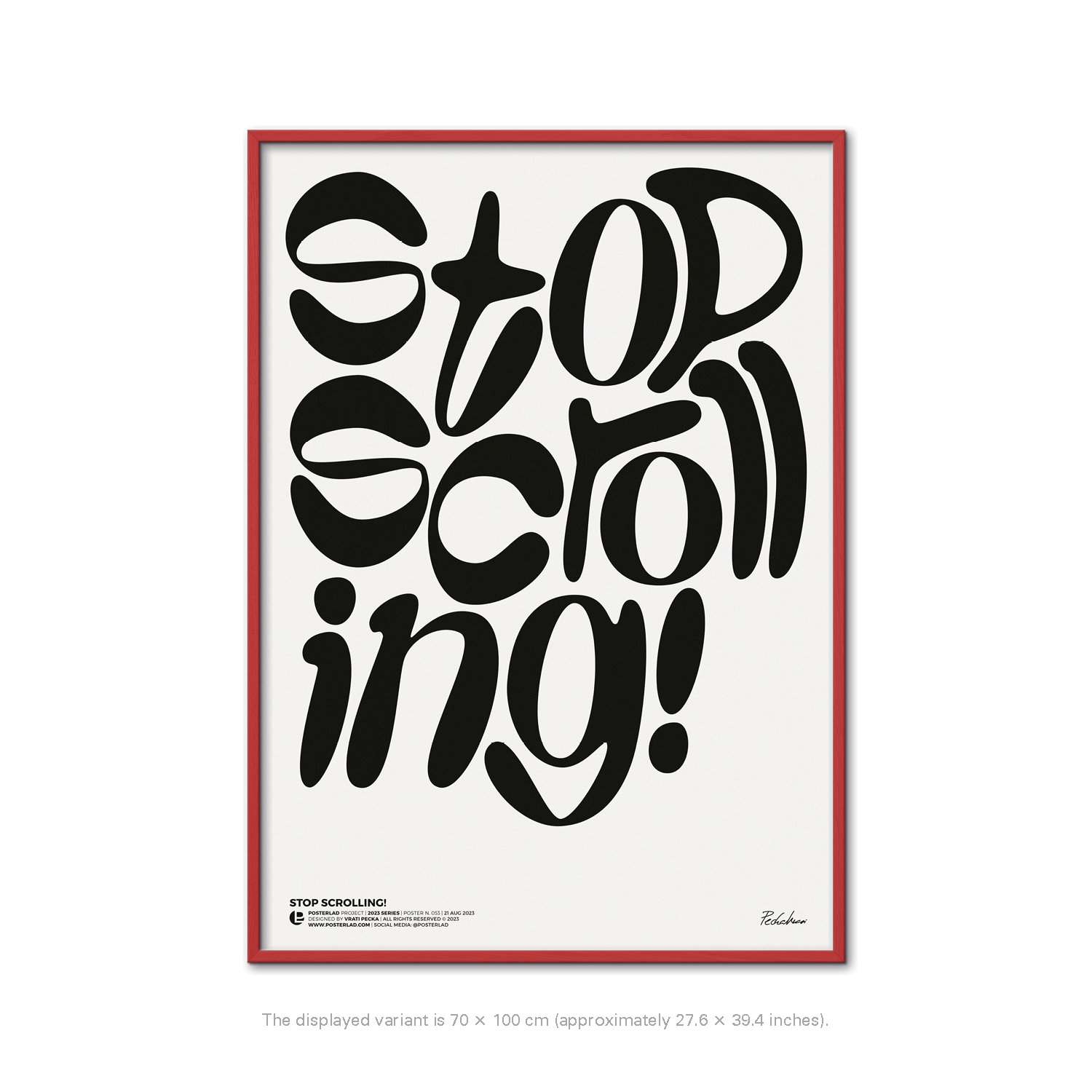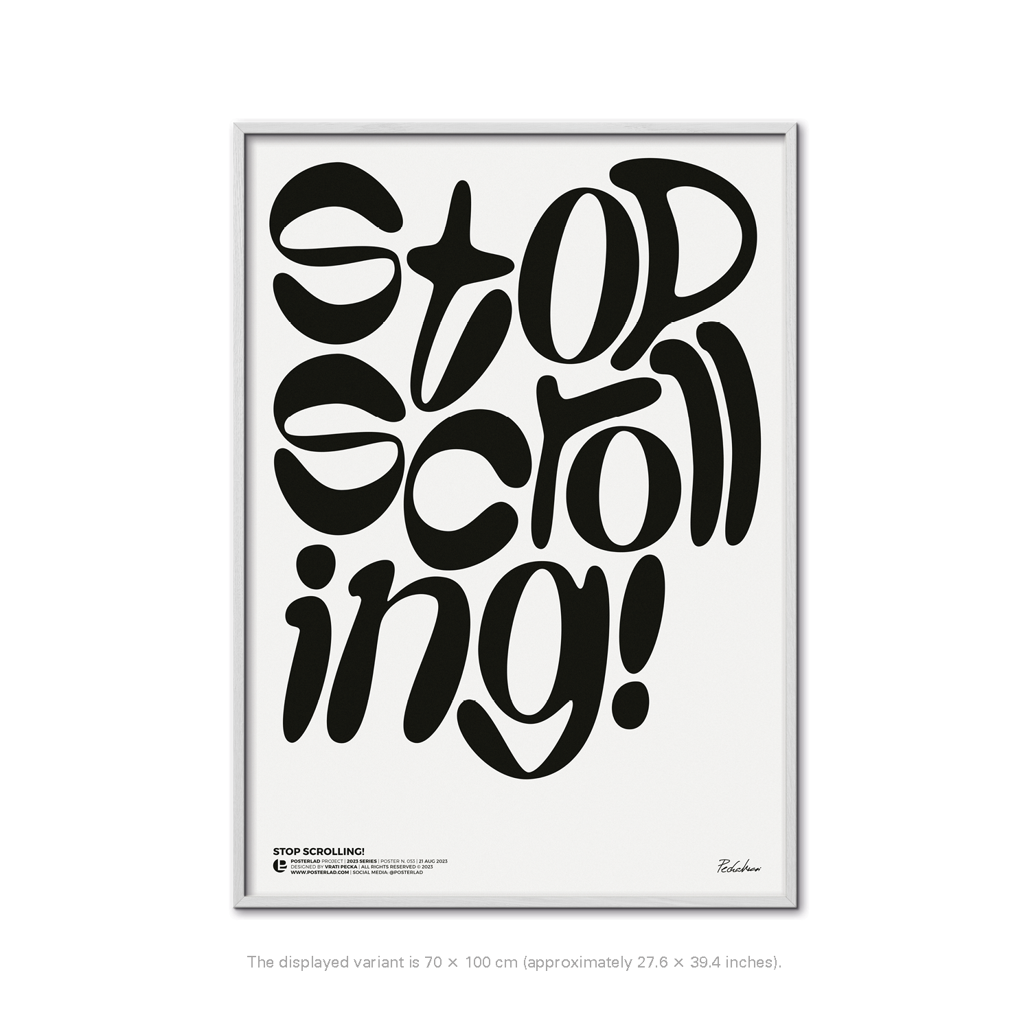 The "Stop Scrolling!" poster delivers a bold and attention-grabbing message through its dynamic hand-drawn typography. The playful yet commanding curves of the letters echo the theme of breaking digital monotony and encouraging viewers to pause and take notice.